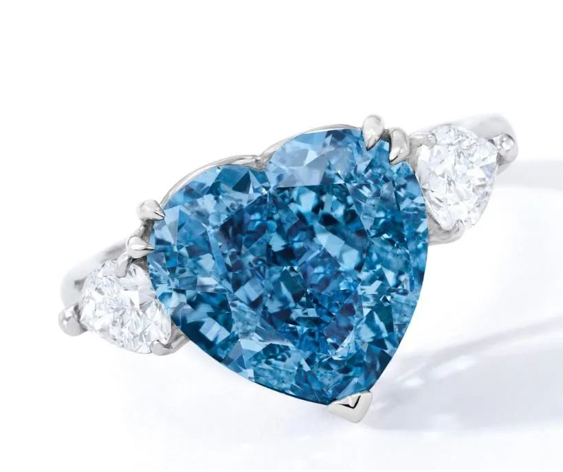 藏品描述:心形改良明亮式切割艳彩蓝钻重约5.04克拉色彩天然,VS2净度、Type IIb两边配镶梨形钻石