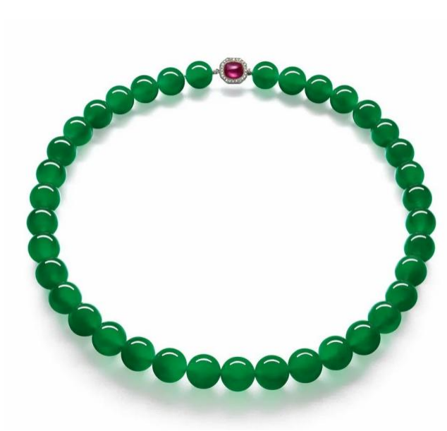 藏品描述:“帝王玉”翡翠珠、红宝石配钻石项链共37枚天然翡翠珠配镶凸圆形红宝石与钻石